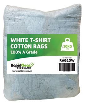 Pomona white t-shirt rags are made from 100% Cotton which are Grade A. They are highly absorbent and durable, making them ideal for cleaning, polishing, or wiping surfaces. Used in a range of industries.