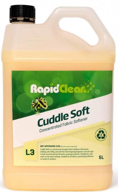 RapidClean Cuddle Soft Fabric Softener performs two roles in one operation softens fabrics as well as eliminating static charge. Cuddle Soft is used during the final rinse cycle after the laundering of towels and bed linen and to reduce the static cling in polyester and other synthetic garments. Cuddle Soft leaves fabrics fragrantly fresh, easy to iron and wrinkle free.
