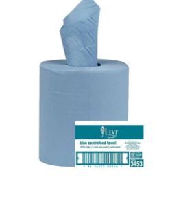 Livi Essentials Towel is blue towel with a centre feed format. It is a strong, absorbent 2 ply towel that is ideal for use in commercial kitchens and food manufacturing areas. Blue paper remains visible when in contact with liquids. The high capacity roll contains 180 metres, making it an ideal continuous paper solution.