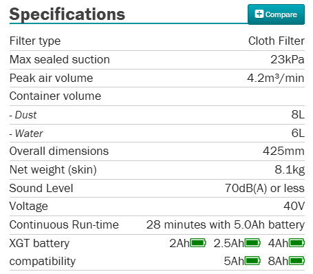 *Max suction with 2x BL4050F