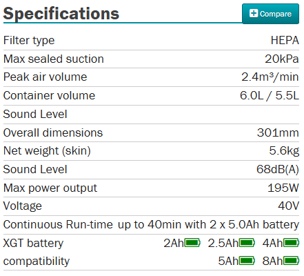 - 40 minute continuous runtime with 2 x BL4050B (High)