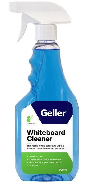Geller Whiteboard Cleaner is a specially formulated ready-to-use spray and wipe cleaning product, suitable for all whiteboard surfaces. It gently cleans the board, removing grease, dirt, dry-erase marker dust and most permanent marker to leave a sparkling clean surface. It comes in a convenient 500ml bottle.