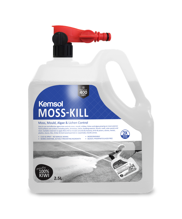 MOSS-KILL will kill and prevent moss, mould, mildew, lichen and algae growing on most hard surfaces. MOSS-KILL is biodegradable. MOSS-KILL has low toxicity for plants and animals. But as a precaution any foliage should be fully rinsed if contact occurs. An ideal “Spray-on and leave” solution for controlling moss, mould and algae.